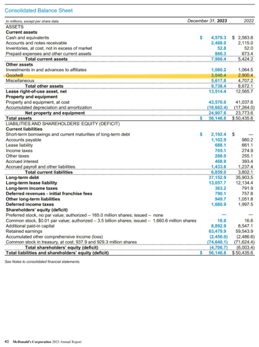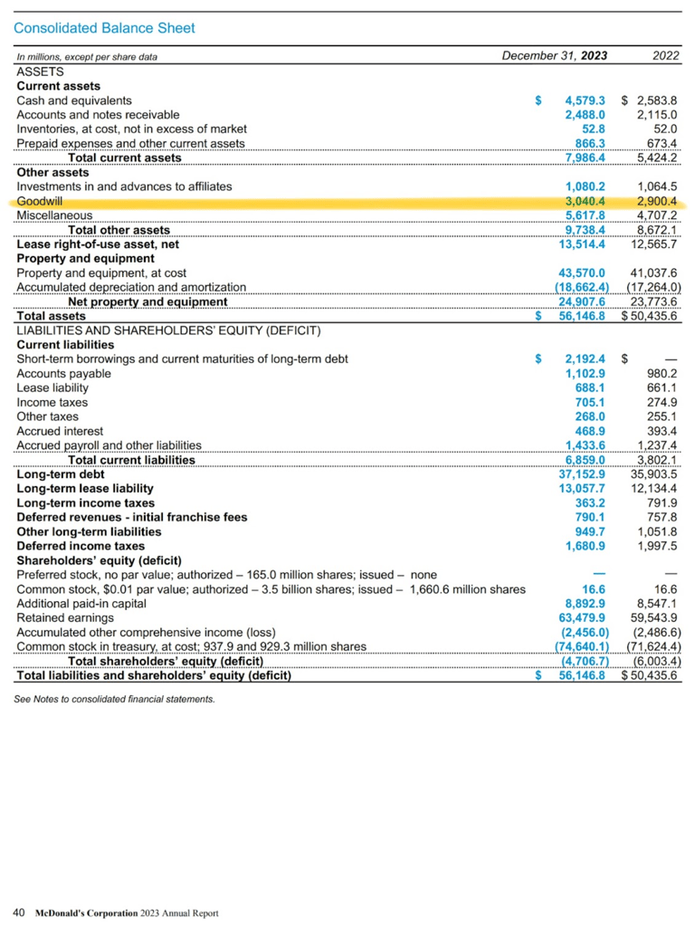 As companies become established and a customer base is built a line item appears in the Assets section of your Balance Sheet. Your accountant calls this item either Goodwill or Intangible Assets. I'll give you an example. Look at the line I highlighted on McDonald's 2023 Balance Sheet below. You'll see that the 2023 value of McDonald’s “Goodwill” is over $3 billion. Although this isn't a "physical" asset, it is a very real asset for your business that is realized upon your company's sale. Think of it like a Savings account.